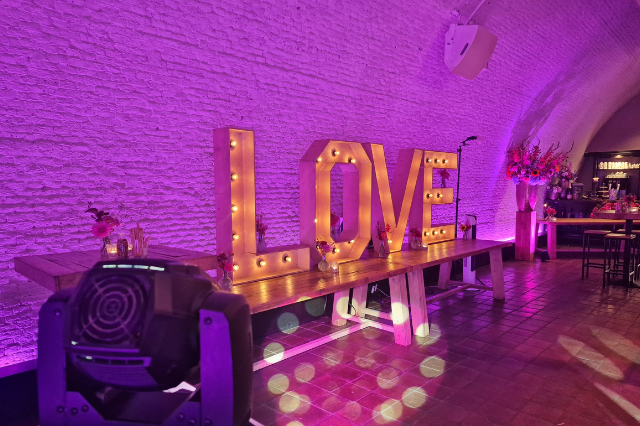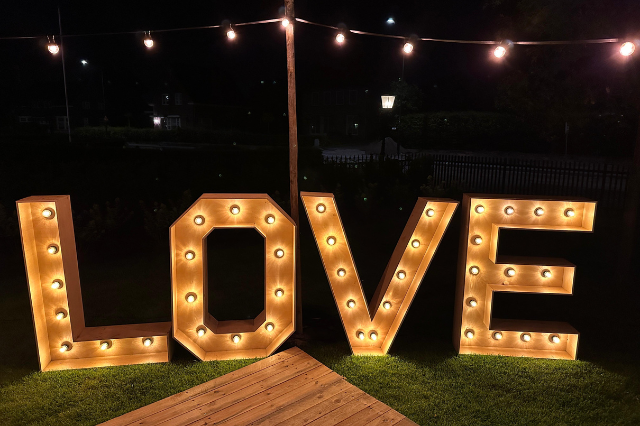 Onze Lichtletters worden vooral gehuurd bij bruiloften en dan met name tijdens de ceremonie. Wist u trouwens dat wij ook de geluidstechniek tijdens de ceremonie verzorgen? De bruiloft lichtletters worden altijd gehuurd voor 1 dag, dat betekend dat de bruiloft lichtletters na de ceremonie nog verplaatst kunnen worden naar het huwelijksfeest, waar het woord LOVE nog mooier tot zijn recht komt doordat het donkerder is in de feestzaal.