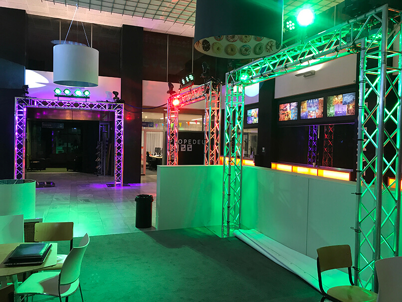 Staat u op een beurs? Dan wilt u er natuurlijk zeker van zijn dat uw stand opvalt. Dat is waar Psound u mee kan helpen. Door middel van verlichting en geluid zorgen wij ervoor dat niemand om uw beursstand heen kan. Indien gewenst kleuren wij de gehele stand in uw bedrijfskleuren en zorgen wij ervoor dat uw logo duidelijk zichtbaar is. Door middel van het licht en het geluid maken wij uw stand mysterieus en toegankelijk tegelijkertijd. De beleving is erg belangrijk voor de bezoekers en voor u is het natuurlijk belangrijk dat de boodschap duidelijk wordt. Wij gaan graag met u in gesprek en laten u zien wat er allemaal mogelijk is.